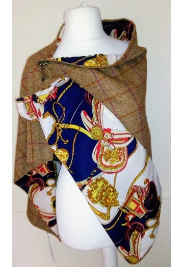 Chestnut brown/orange check tweed cape, fully lined in equestrian, hermes style lining. Brass horse popper fasteners.