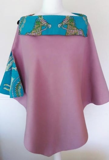 Dressy, blush rose pink warm, wool cape, 2 way wear, fully lined in contrasting aqua / pink horse lining, with matching, double inlay / silver buttons.