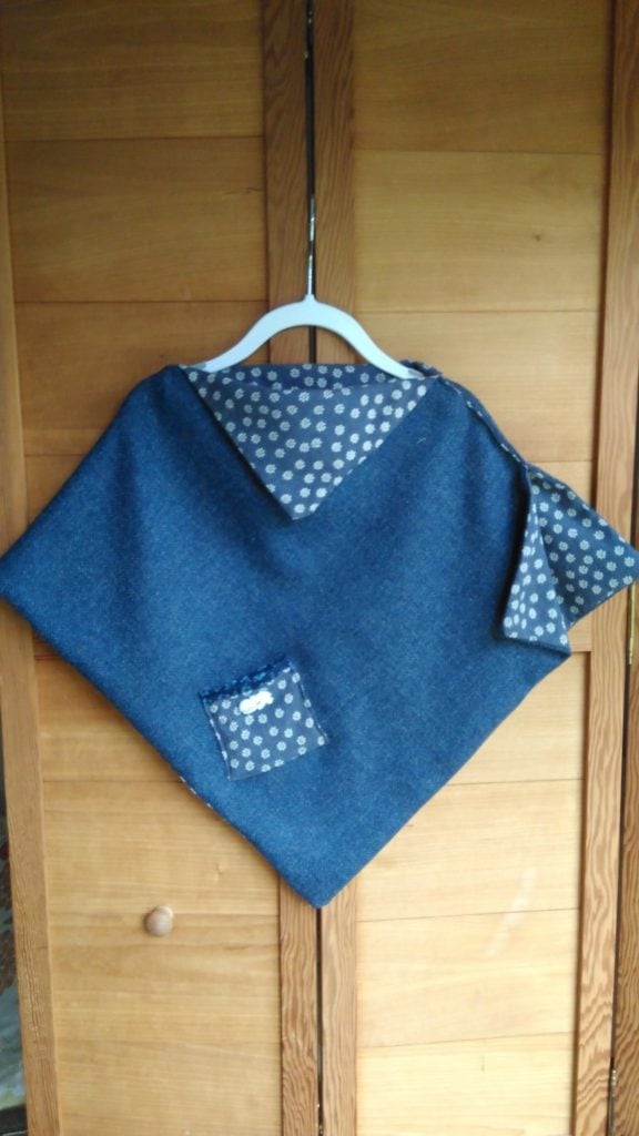 Cobalt blue wool blend cape, fully lined in blue/white flower detail plus pocket.