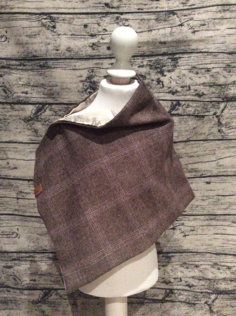 Adorable tweed cape in a coffee colour. Lined with a subtle pig fabric. Collar can be worn up or down. Very versatile and can be popped over any outfit. 100% wool, handmade using the finest Yorkshire tweed.