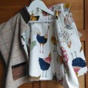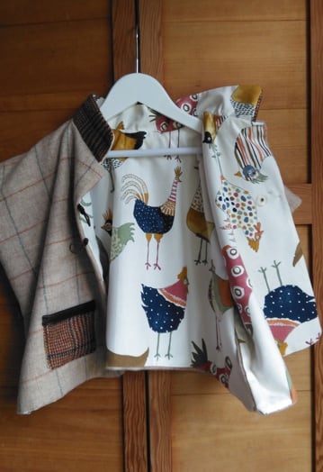 Oatmeal and cinnamon check tweed cape. Fully lined in fun multi rooster print, with leather trim pockets/ fastening and tortoiseshell buttons. Approx 4-7yrs.