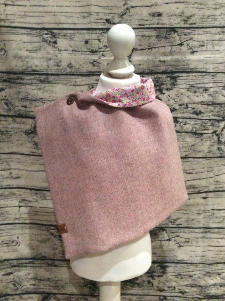 Pink tweed child’s cape 100% wool. Lovely pink ditsy flower lining, finished with a flower button. Versatile item that can be worn easily. Collar can be worn up or down.