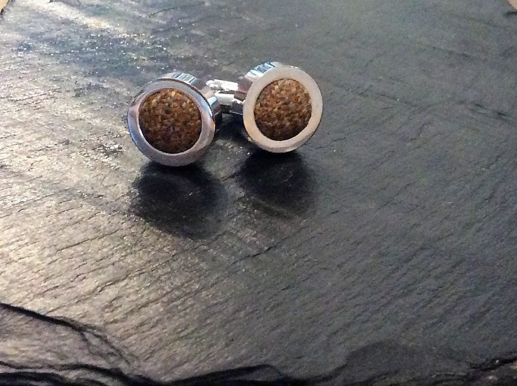 Heavy round cufflinks finished with Tan & Green tweed centres.