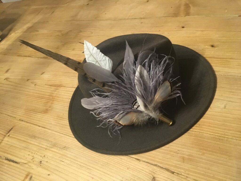 A lovely feather hat pin made with grey toned feathers and finished with a bullet casing
