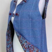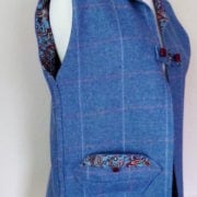 Finest tweed gilet in soft powder blue, with pale pink check, fully lined in striking blue/ruby paisley print and matching side pocket. Dressed with mini square, ruby glass buttons.