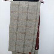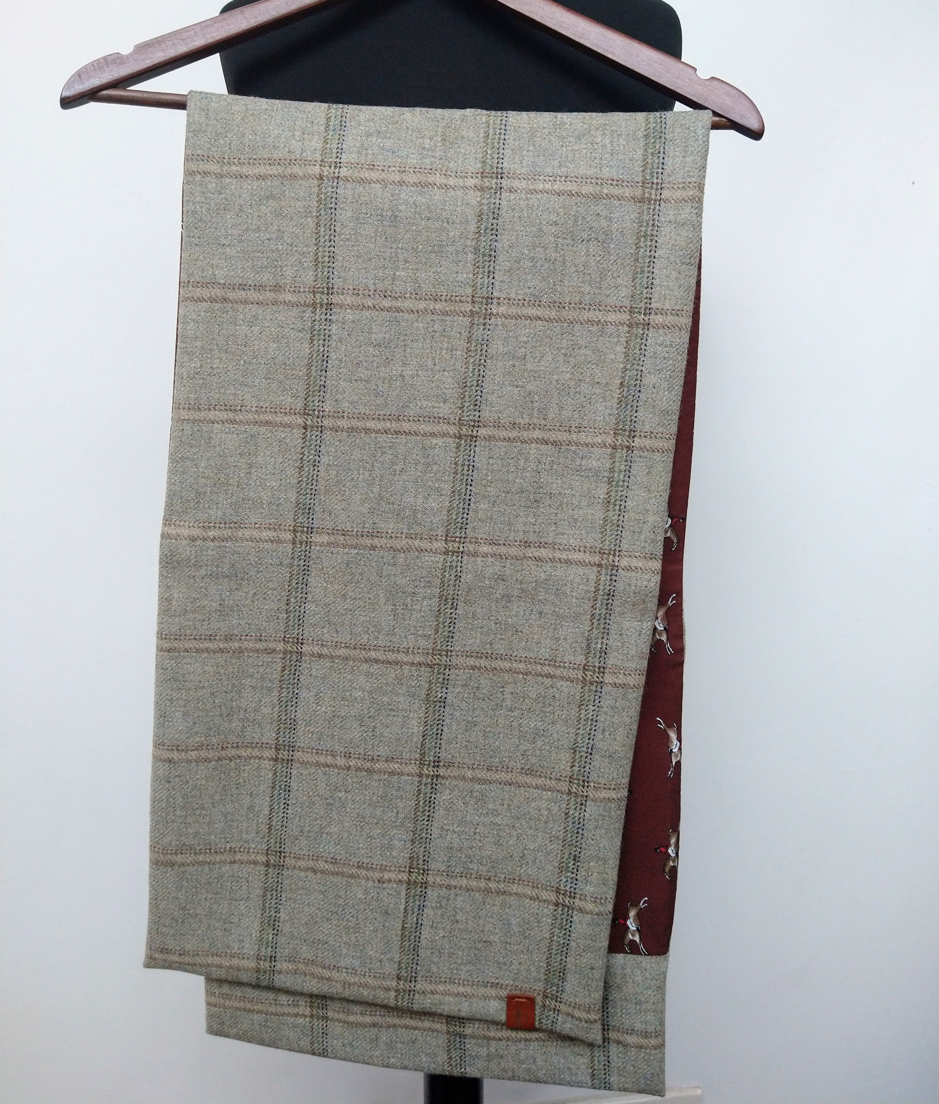 Long, dove blue check tweed neck wrap/scarf, fully lined in horse print. Size: 130cm x 34cm.