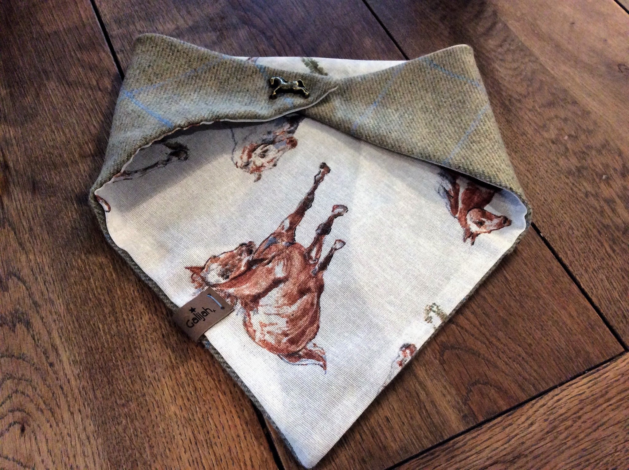 Grey Tweed Neck Wrap. Fully lined with Wild horses lining. Finished with one of our horse fasteners.