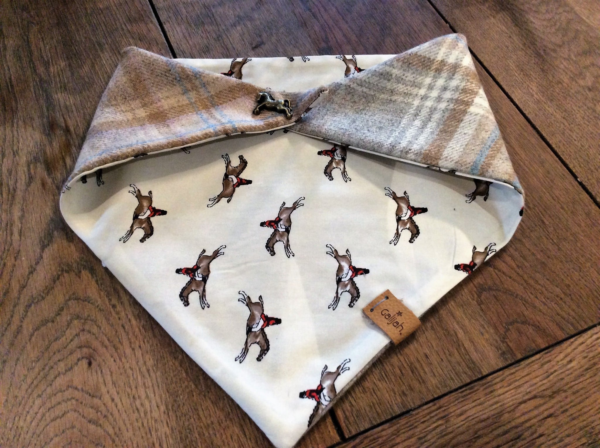 Light coloured Checked Tweed Neck Wrap. Fully lined with an Ivory ditsy horse lining. Finished with one of our horse fasteners.